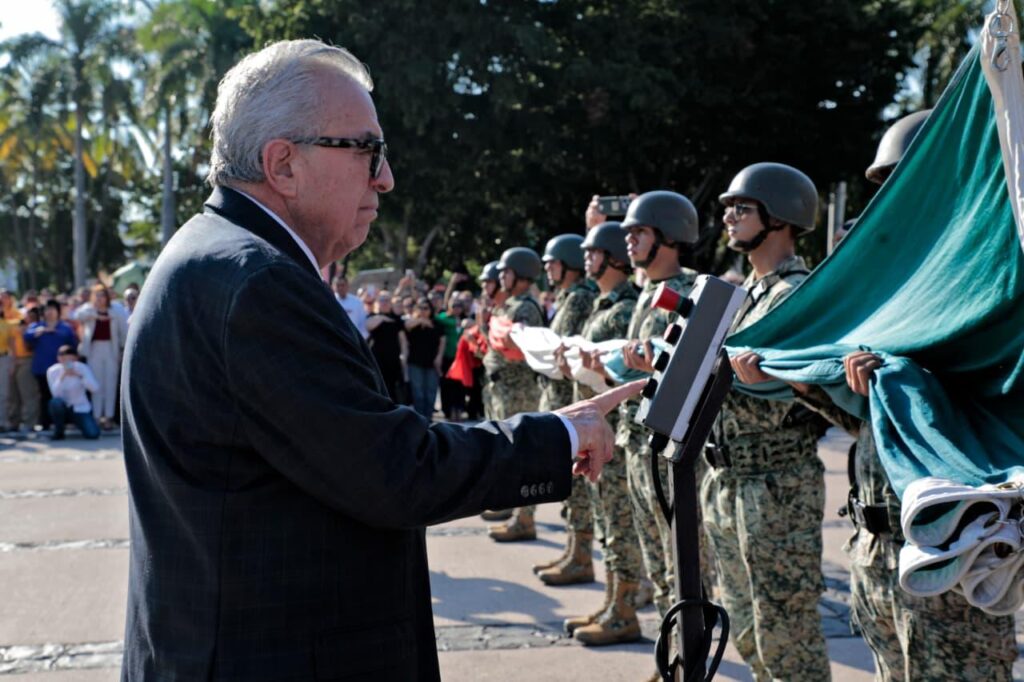 CULIACÁN.- El gobernador Rubén Rocha Moya, acompañado de autoridades civiles y militares presidieron el acto conmemorativo al 142 aniversario del nacimiento del Gral. Ángel Flores y aniversario de los caídos en la lucha de la democracia de la plaza de las Tres Culturas, en Tlatelolco, con el izamiento de bandera a media hasta y honores de ordenanza en la plaza cívica de Palacio de Gobierno.
