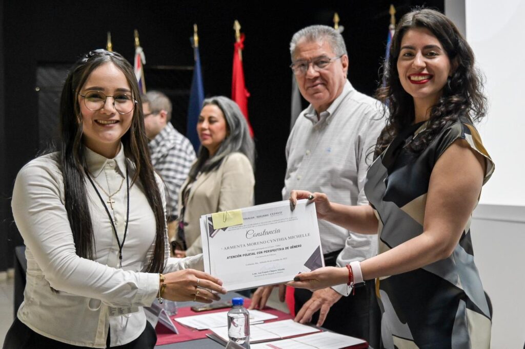 CULIACÁN.- La Secretaría de las Mujeres del Gobierno del Estado de Sinaloa y la Universidad de la Policía (UNIPOL) llevaron a cabo la ceremonia de entrega de constancias a mujeres y hombres cadetes por la culminación de su profesionalización en materia de: Atención Policial con Perspectiva de Género.