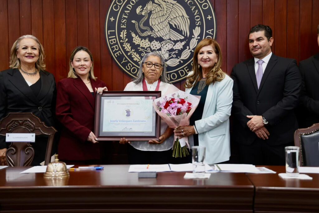 La secretaria Bonilla entregó junto con el presidente de la Mesa Directiva de la LXV Legislatura, el diputado Rodolfo Valenzuela Sánchez y la presidenta de la Junta de Coordinación Política, diputada María Teresa Guerra Ochoa, el reconocimiento, medalla y un estímulo económico a la acreedora de este premio, a la señora Josefa Velázquez, y al hacerlo destacó que al otorgar este reconocimiento el Congreso del Estado no sólo honra a la galardonada, sino a todas las mujeres que con trabajo silencioso sostienen la vida y la esperanza en nuestras comunidades.
